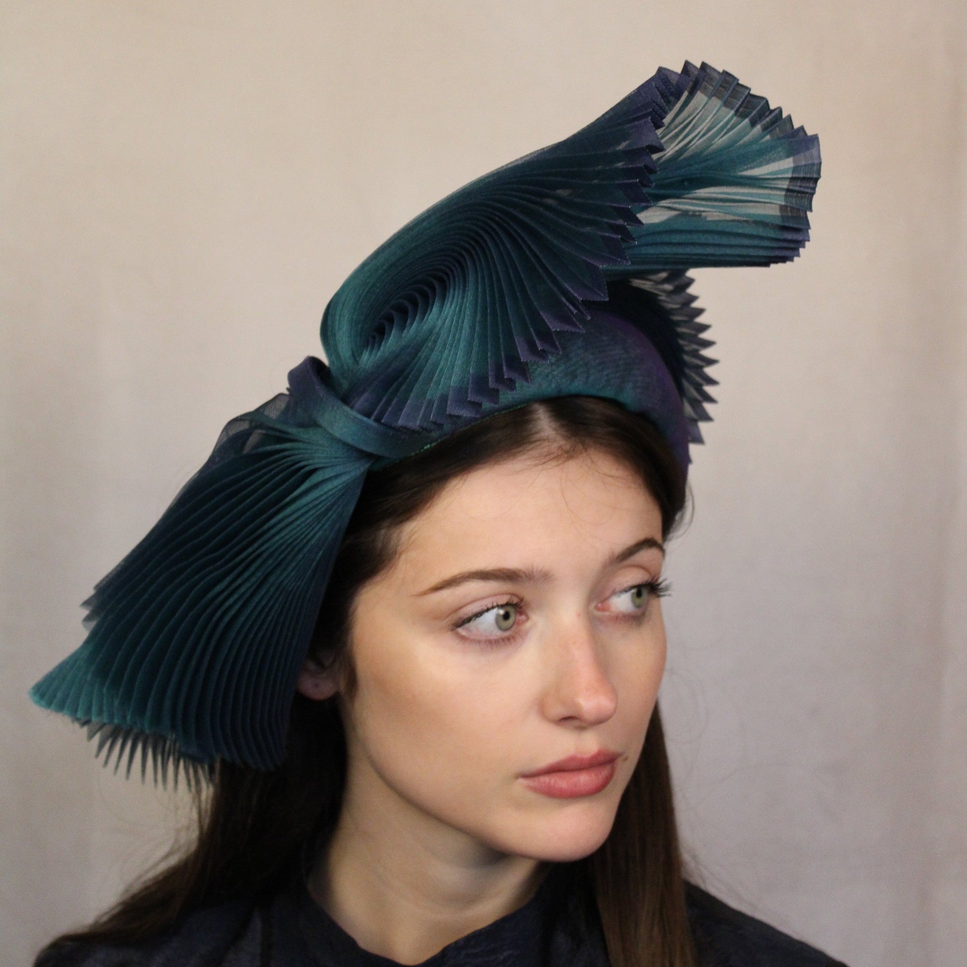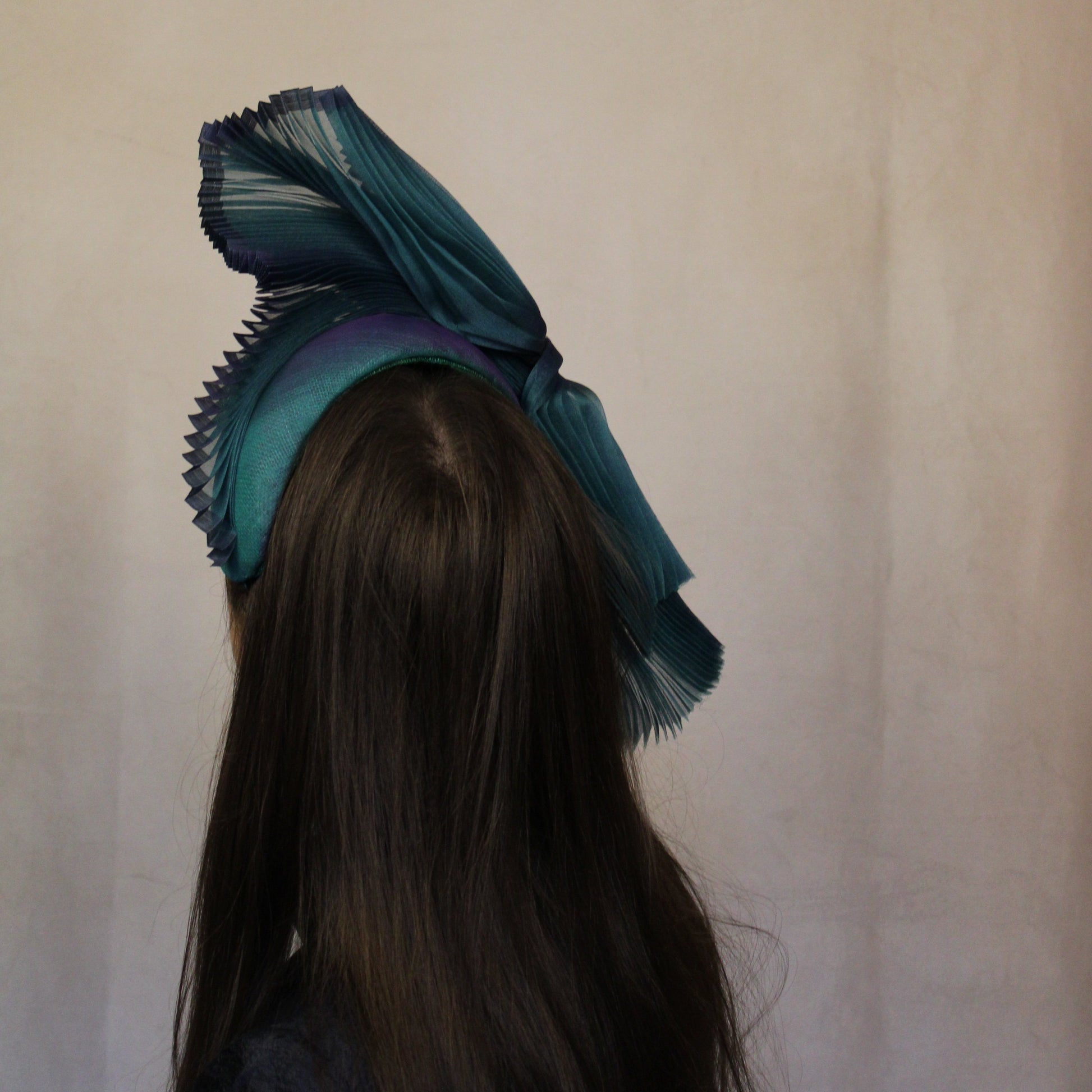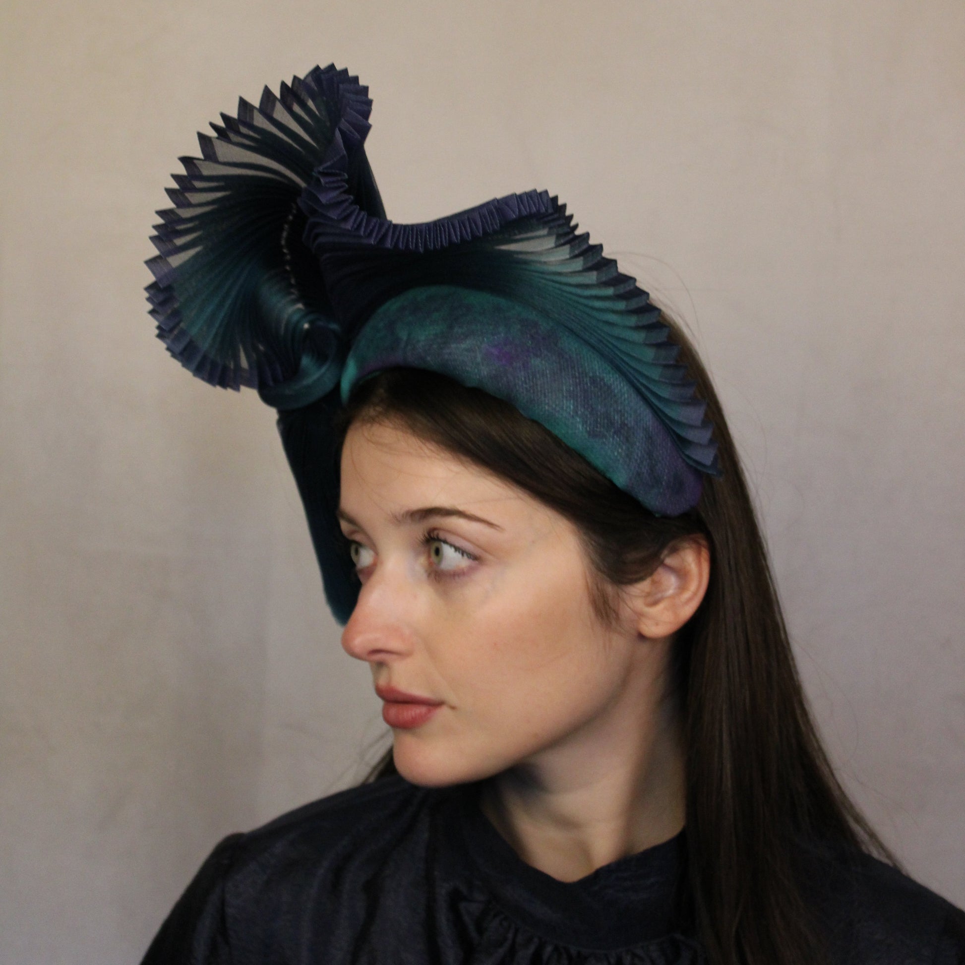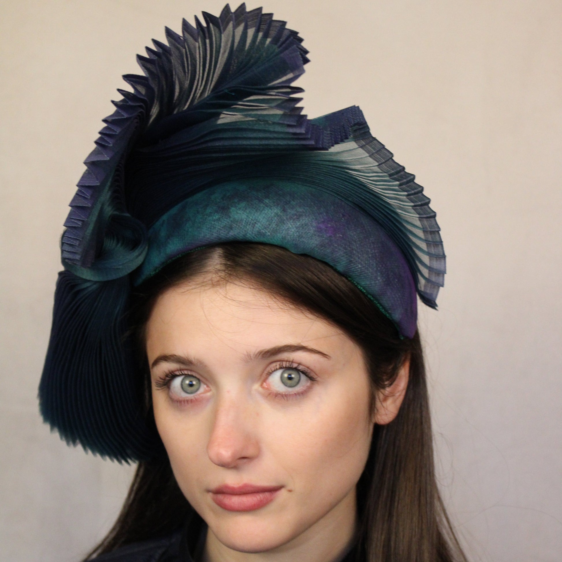 With hints of green and purple, A Silk pleated organza on a sinamay halo band. Hand painted finish. Secured with hat elastic and comb.