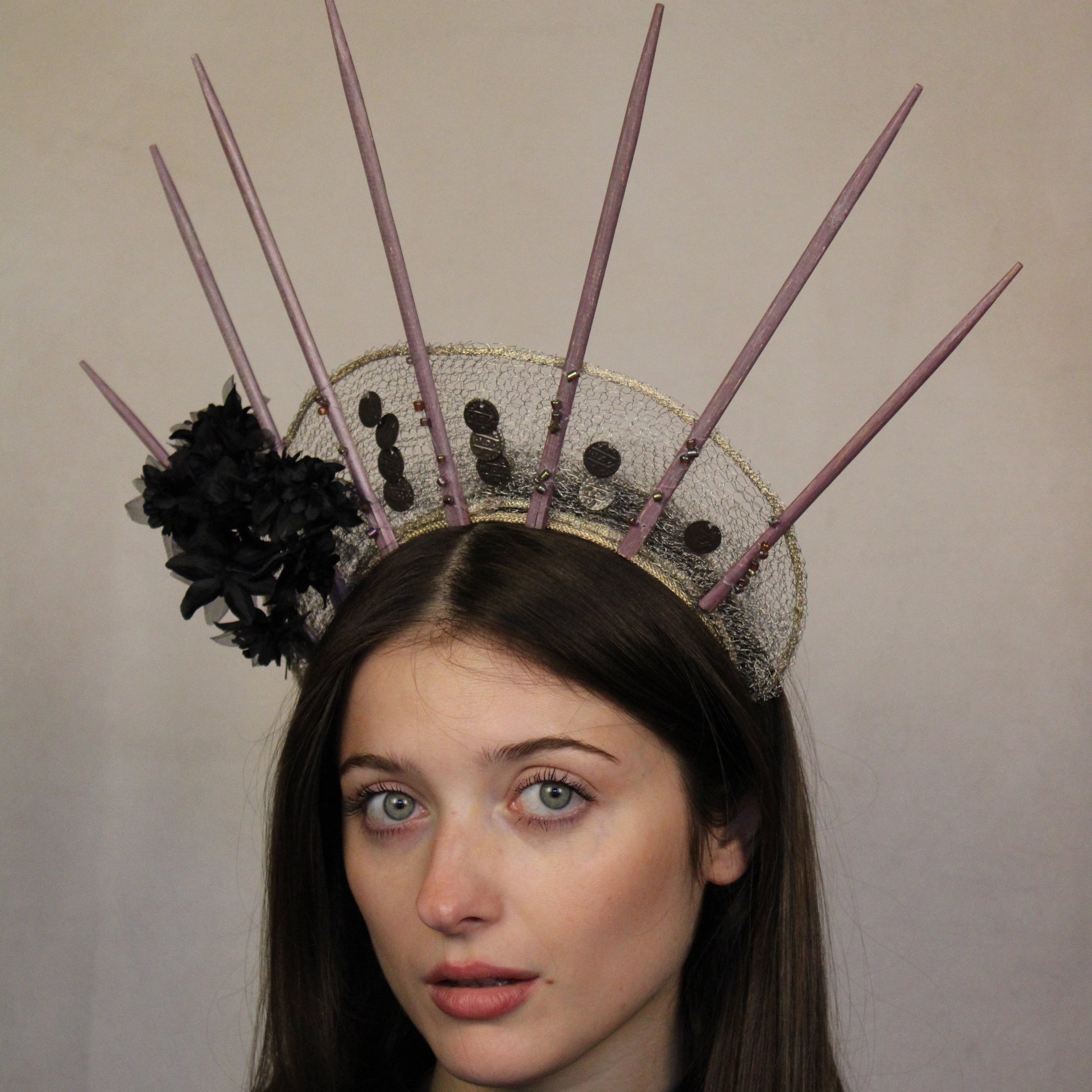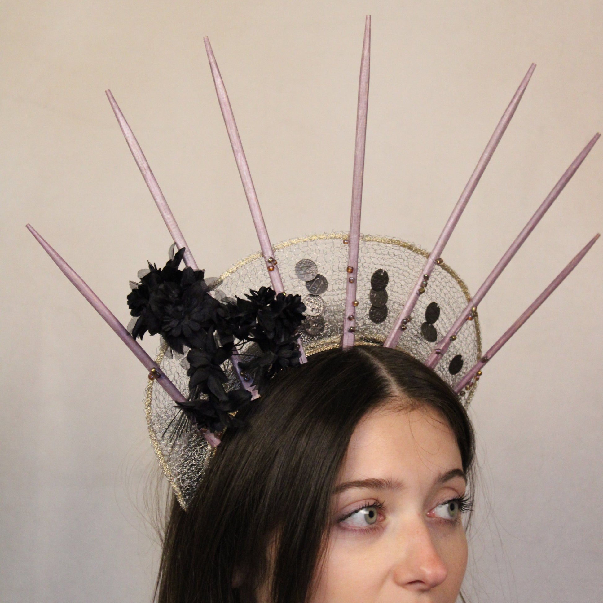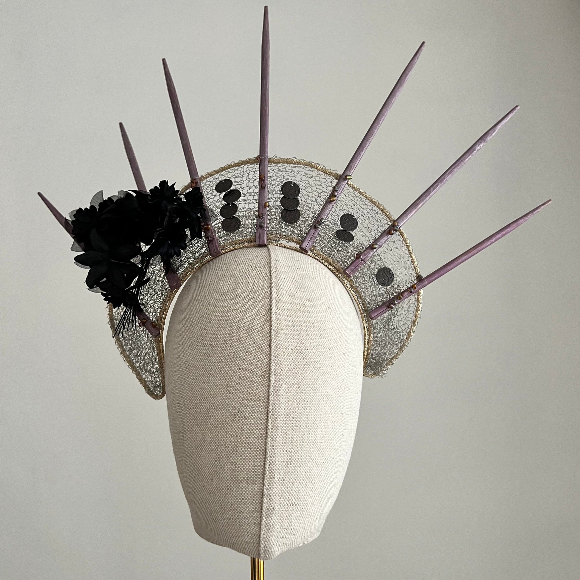 Handmade bespoke headpiece with metal mesh, decorated with coins and pretty black flowers. Pale purple wooden spikes make this a striking piece.