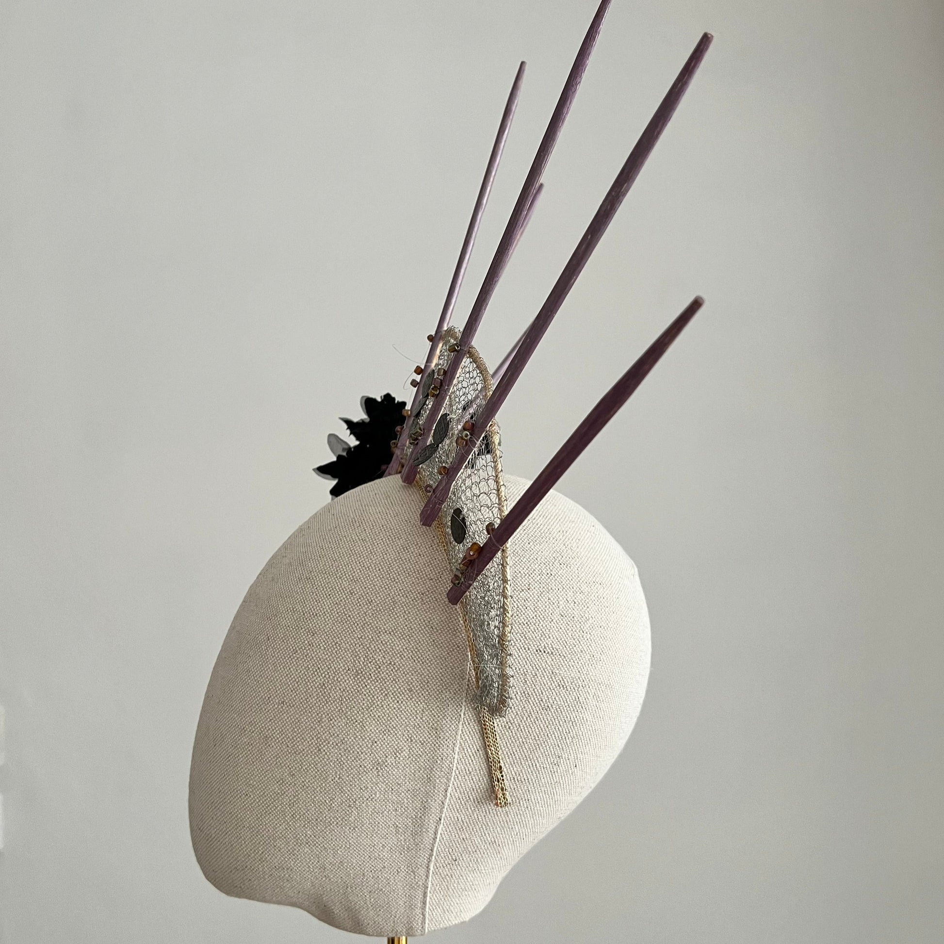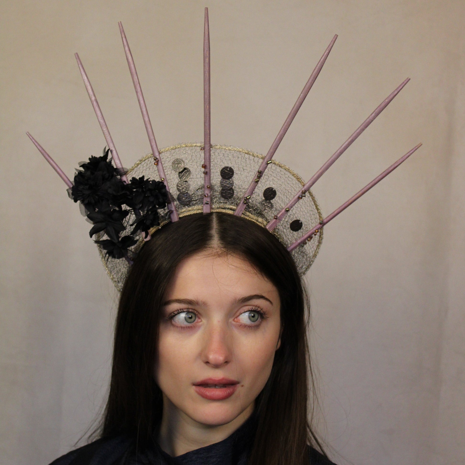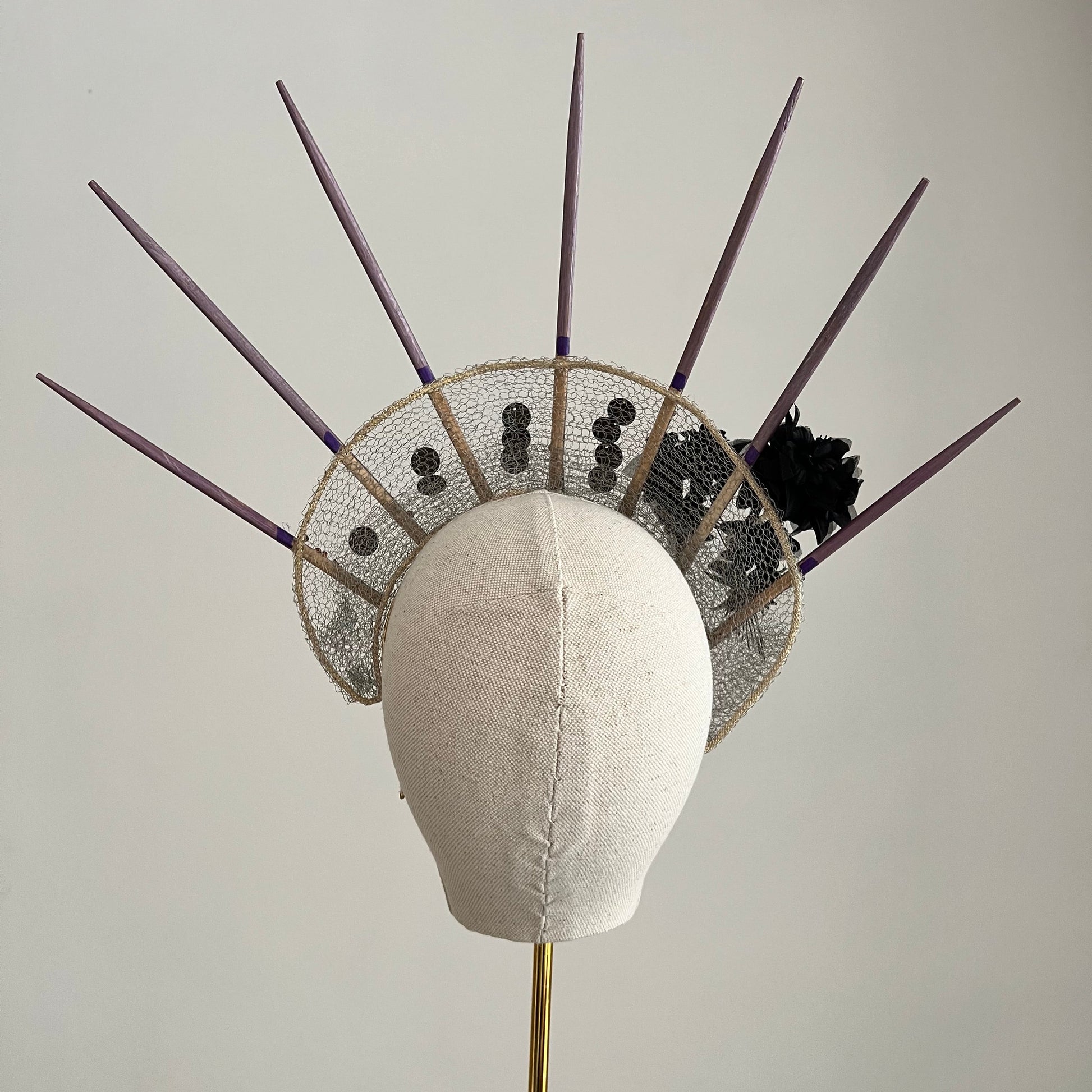 Handmade bespoke headpiece with metal mesh, decorated with coins and pretty black flowers. Pale purple wooden spikes make this a striking piece.