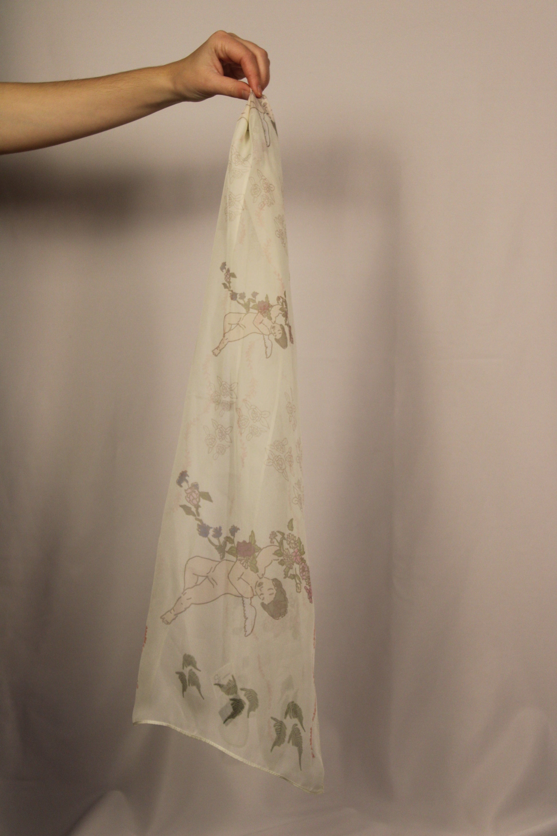 A chiffon scarf with a cherub and flowers on.