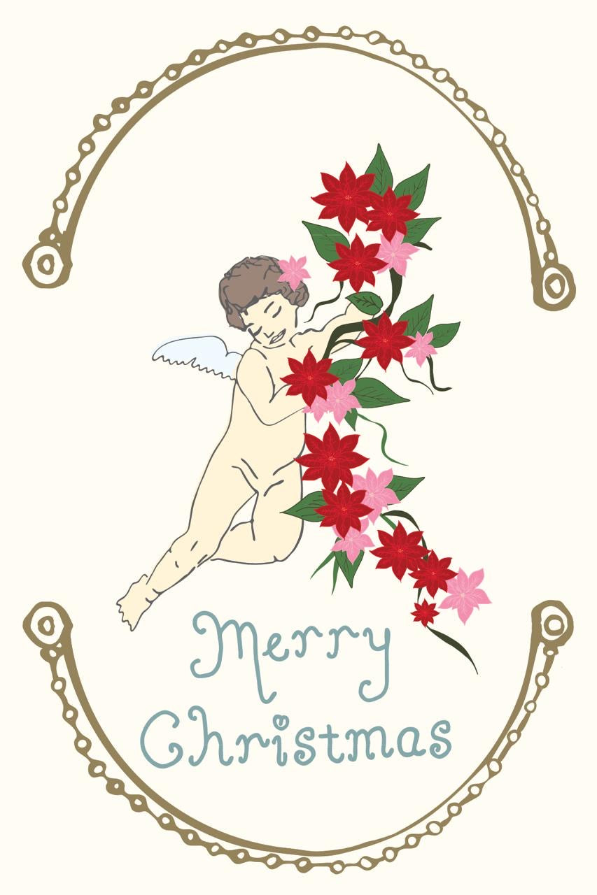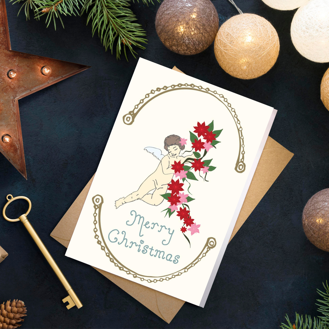 Hand drawn Christmas card with Cherubs, Pink flowers and daisies. Printed on a 105mm x 148mm card with white envelope.