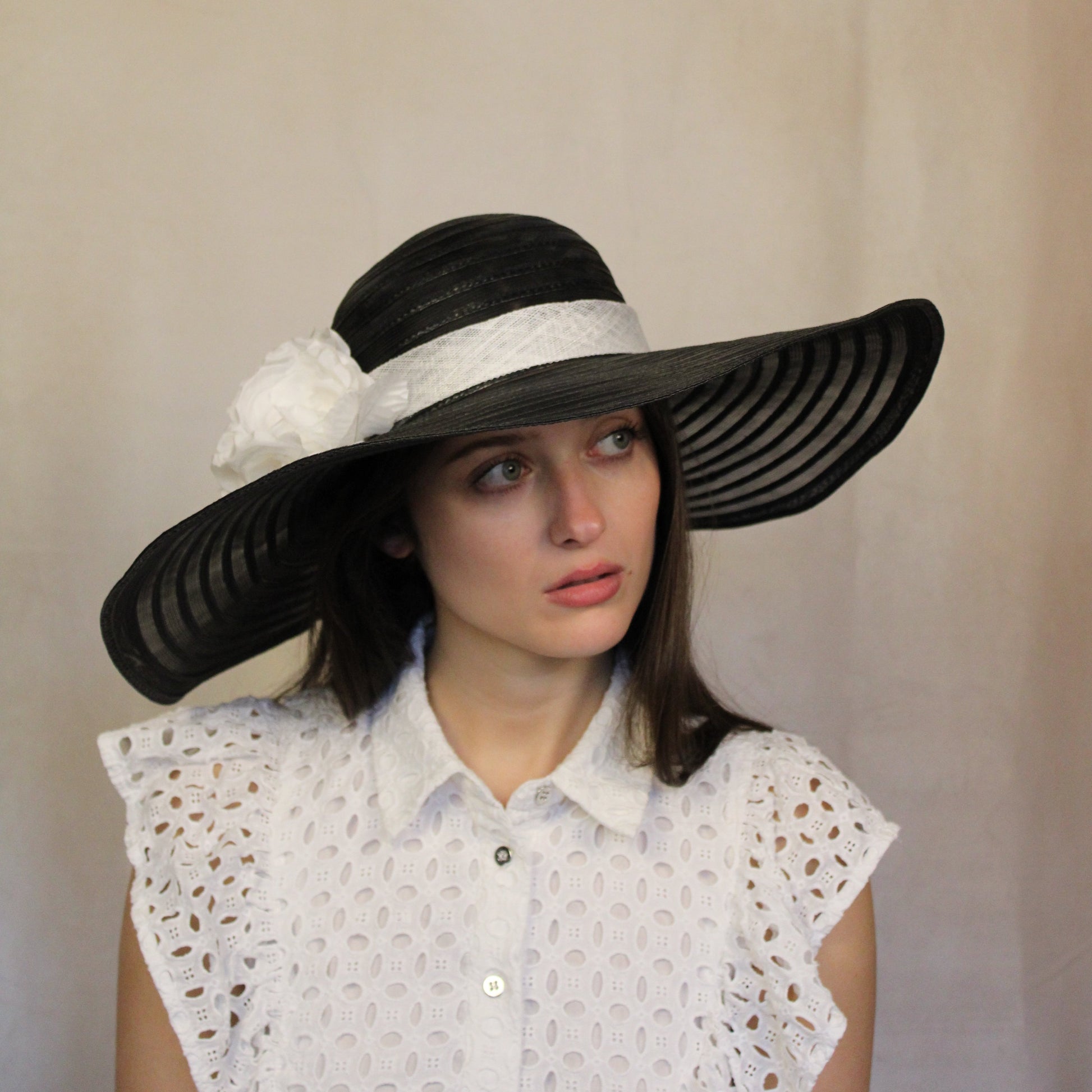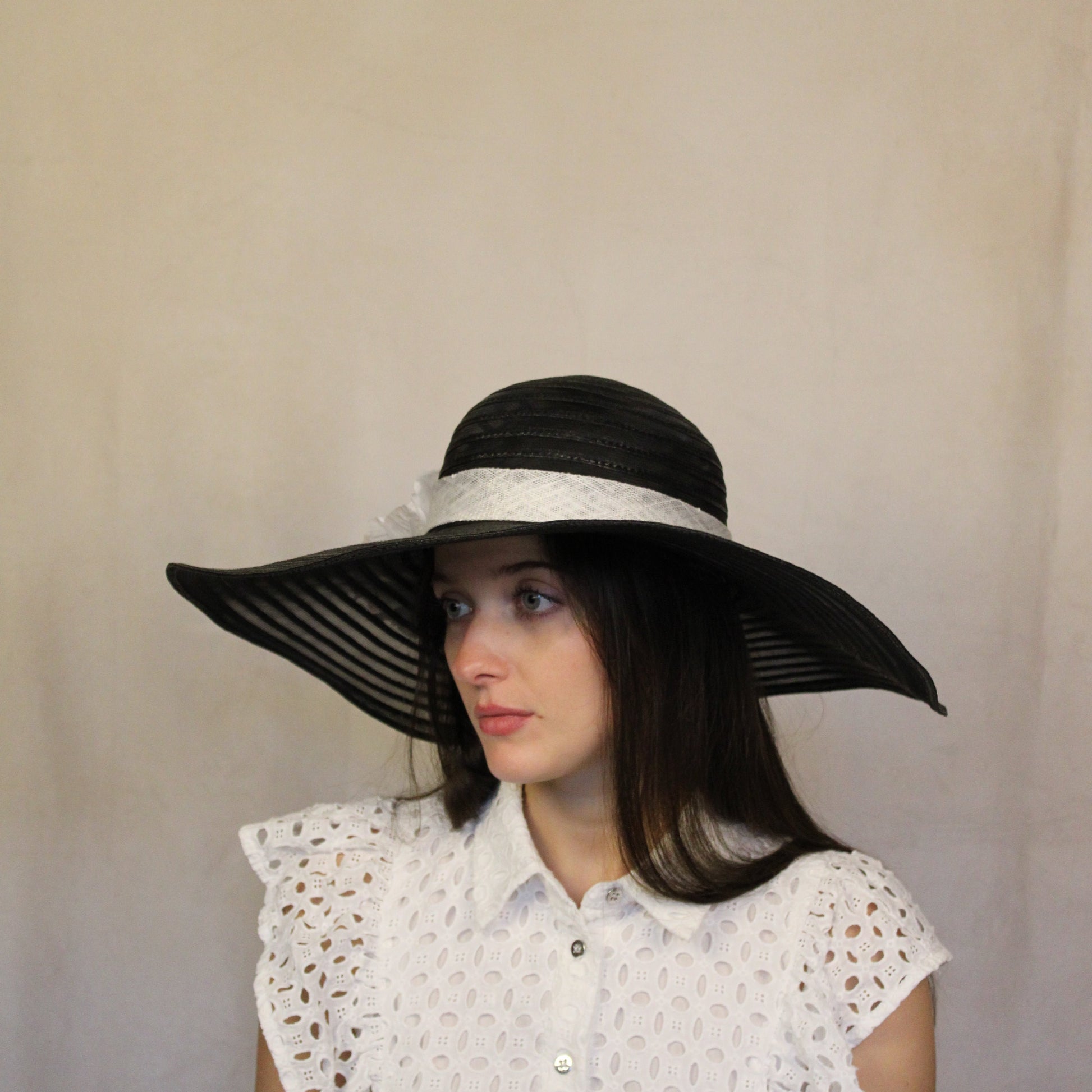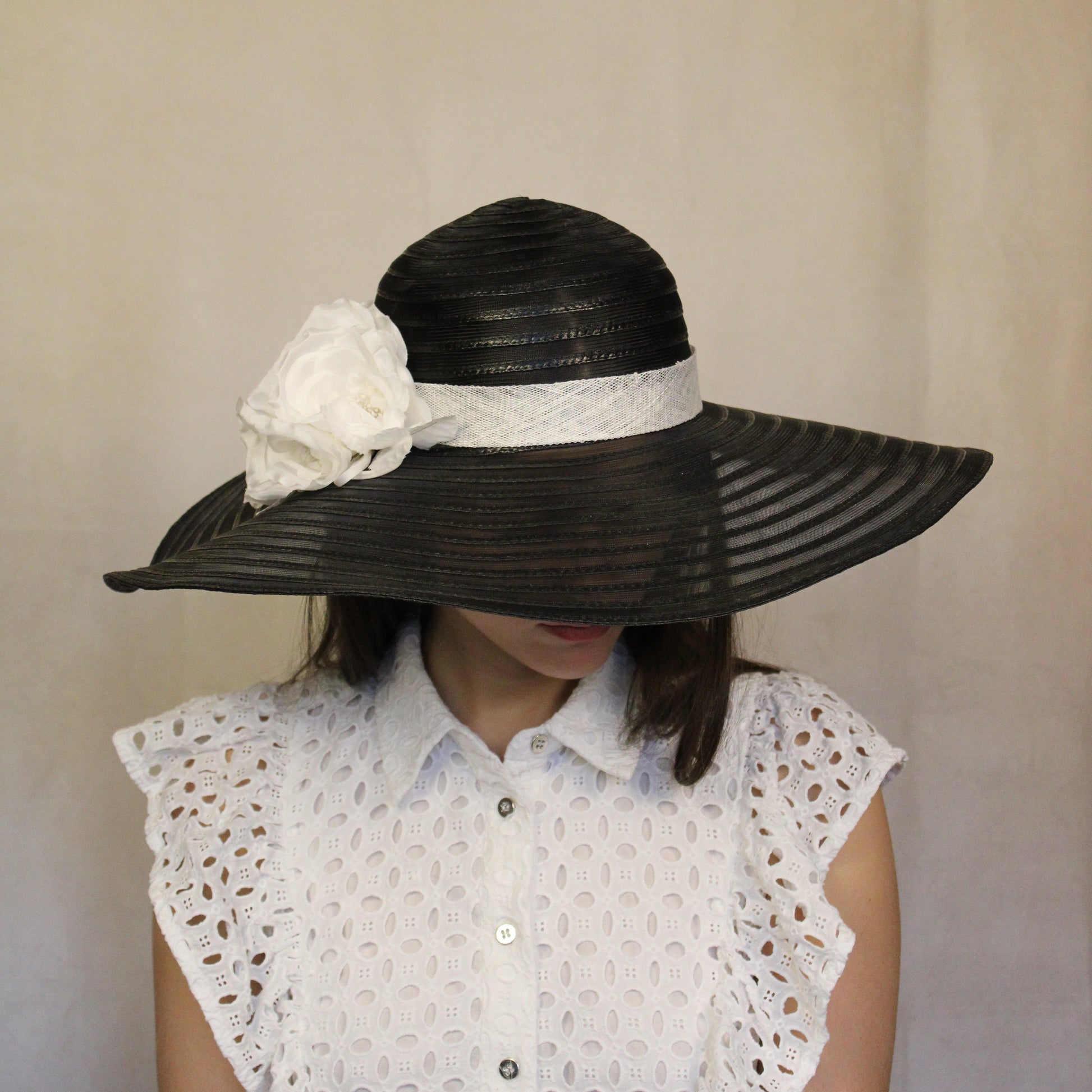 Black and white sun hat with silk flowers
