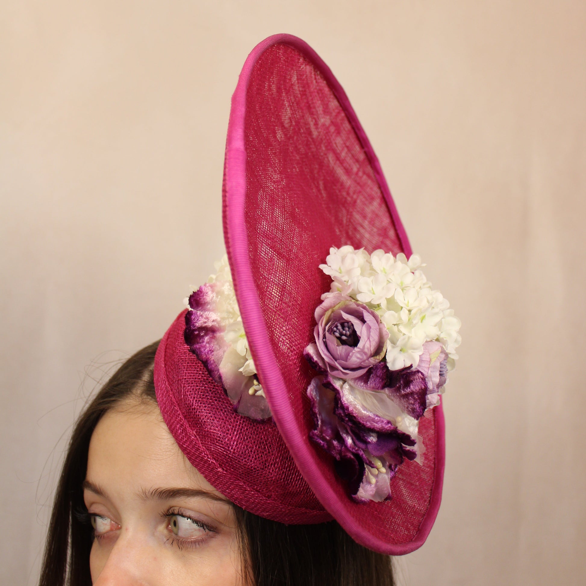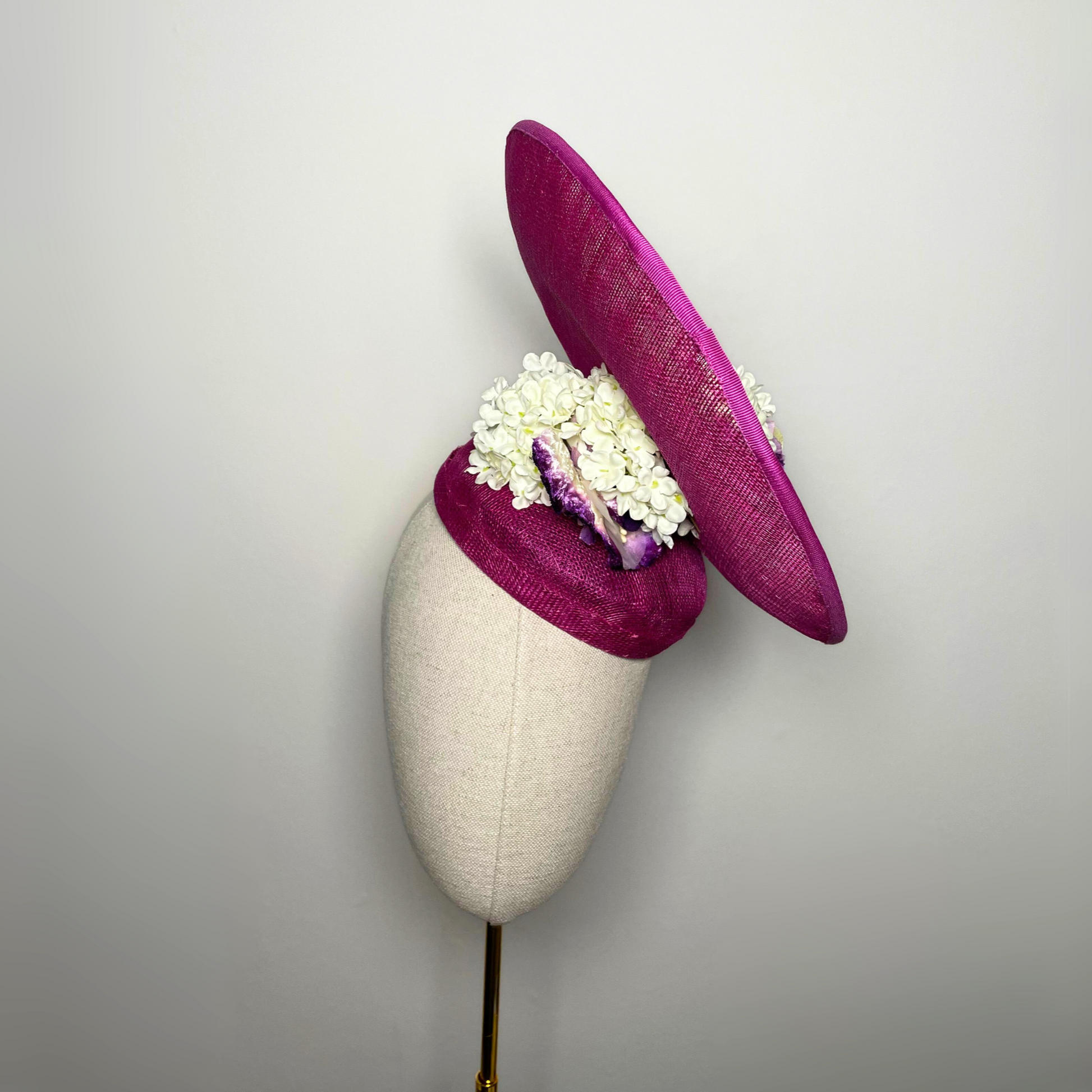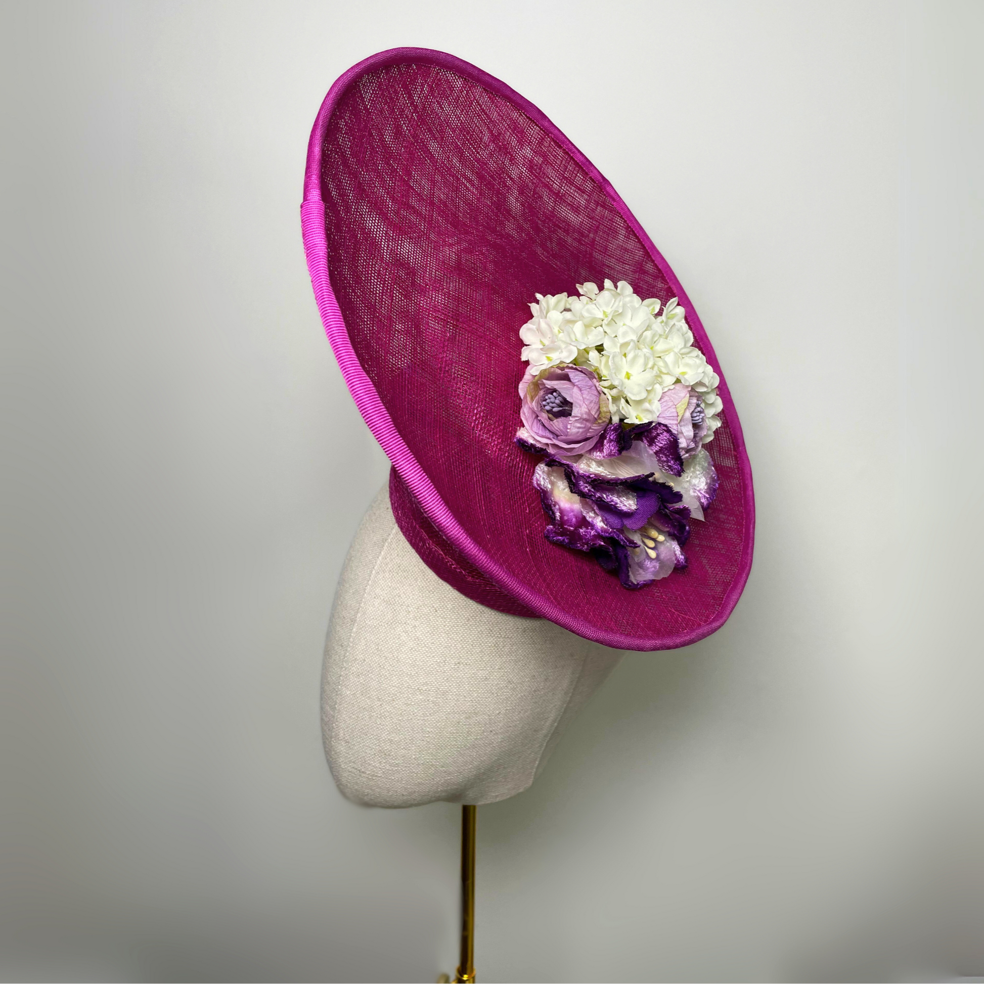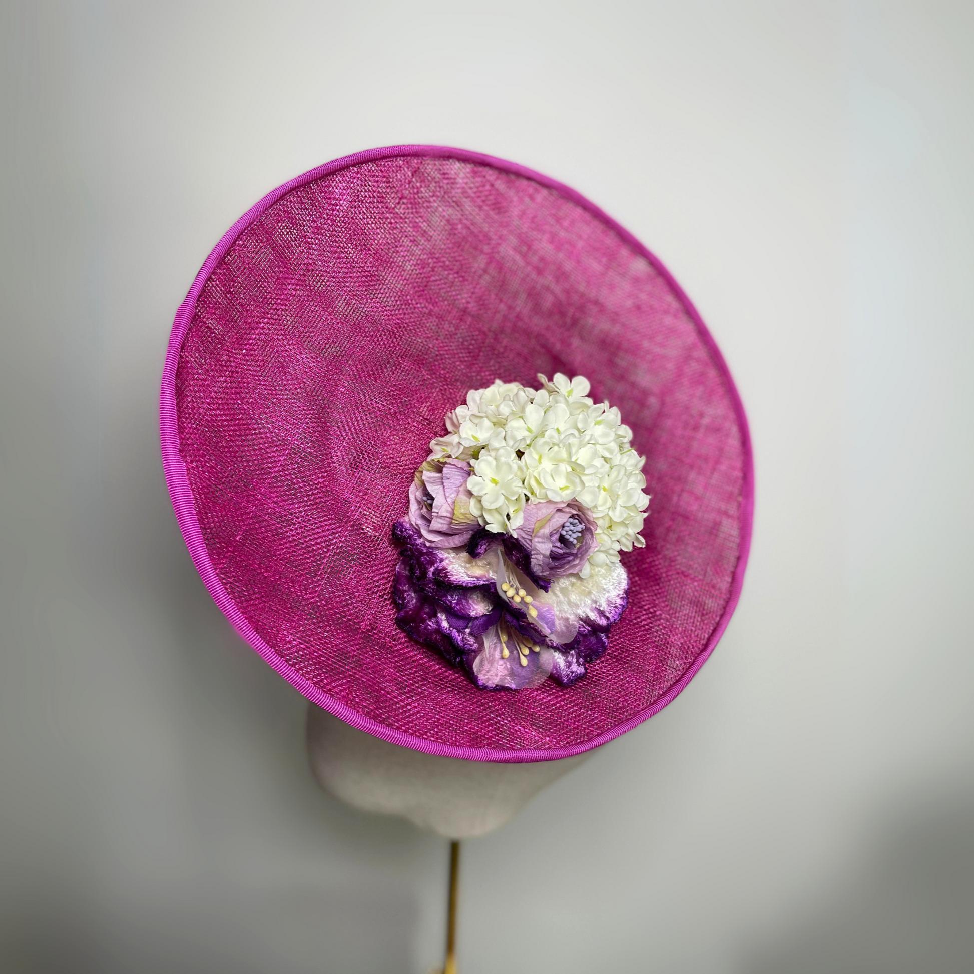 Beautiful hand made luxury fuchsia pink floral hat with off-white and lilac purple flowers. This elegant hat would be the perfect accompaniment to a mother of the bride, or a race day look. It features an elastic attachment which secures the fascinator to the head - please let me know what hair colour you have when ordering so I can customise the elastic to match your hair tone.