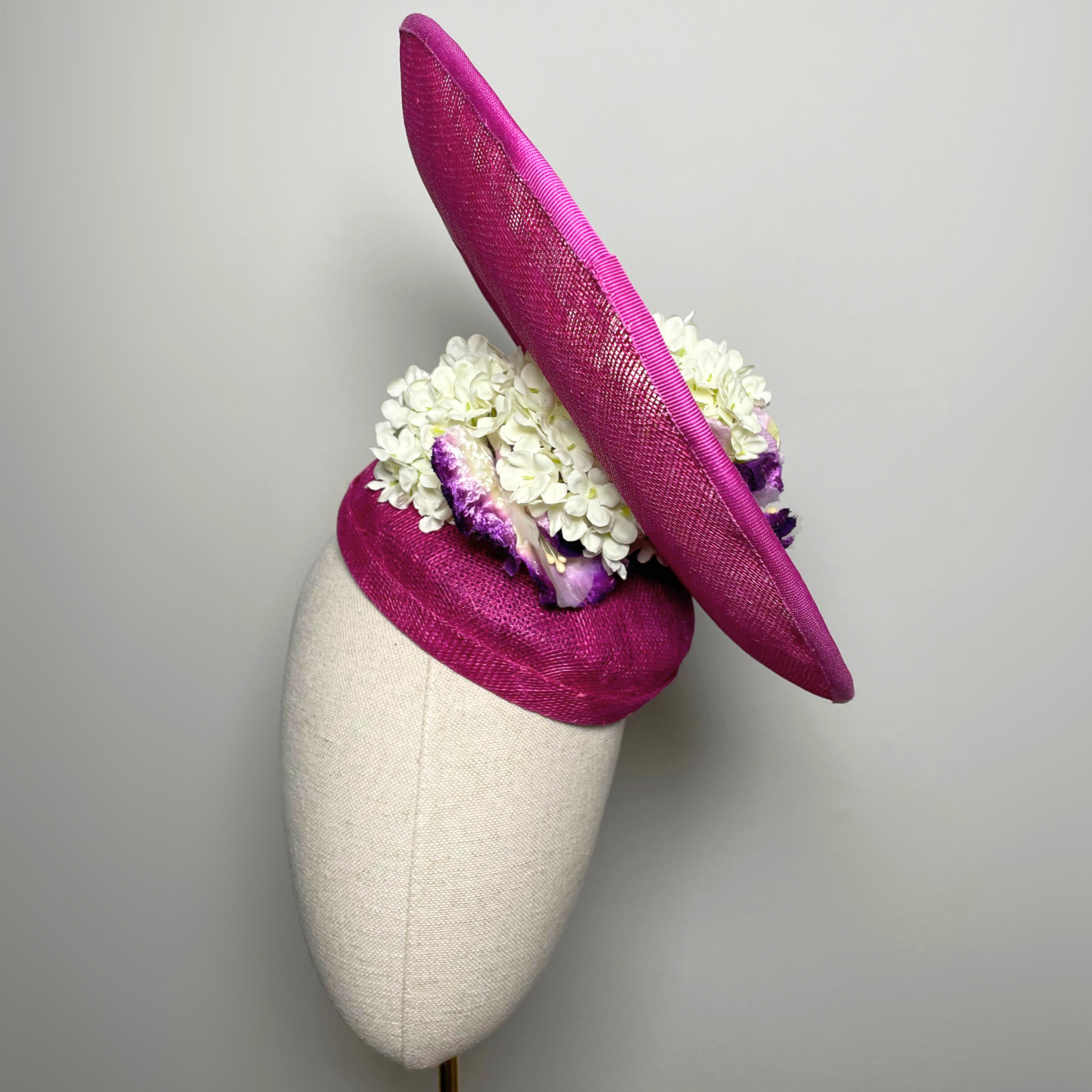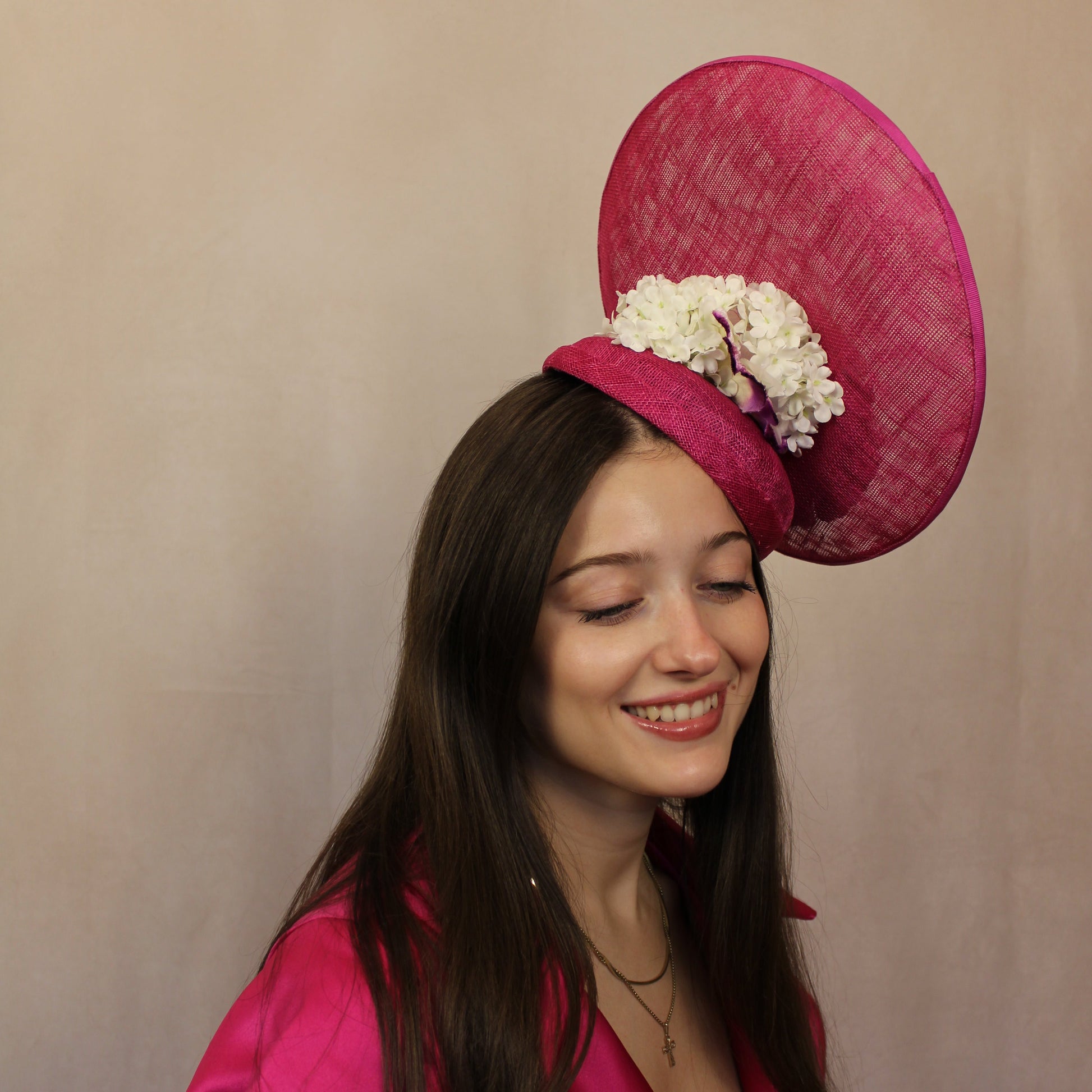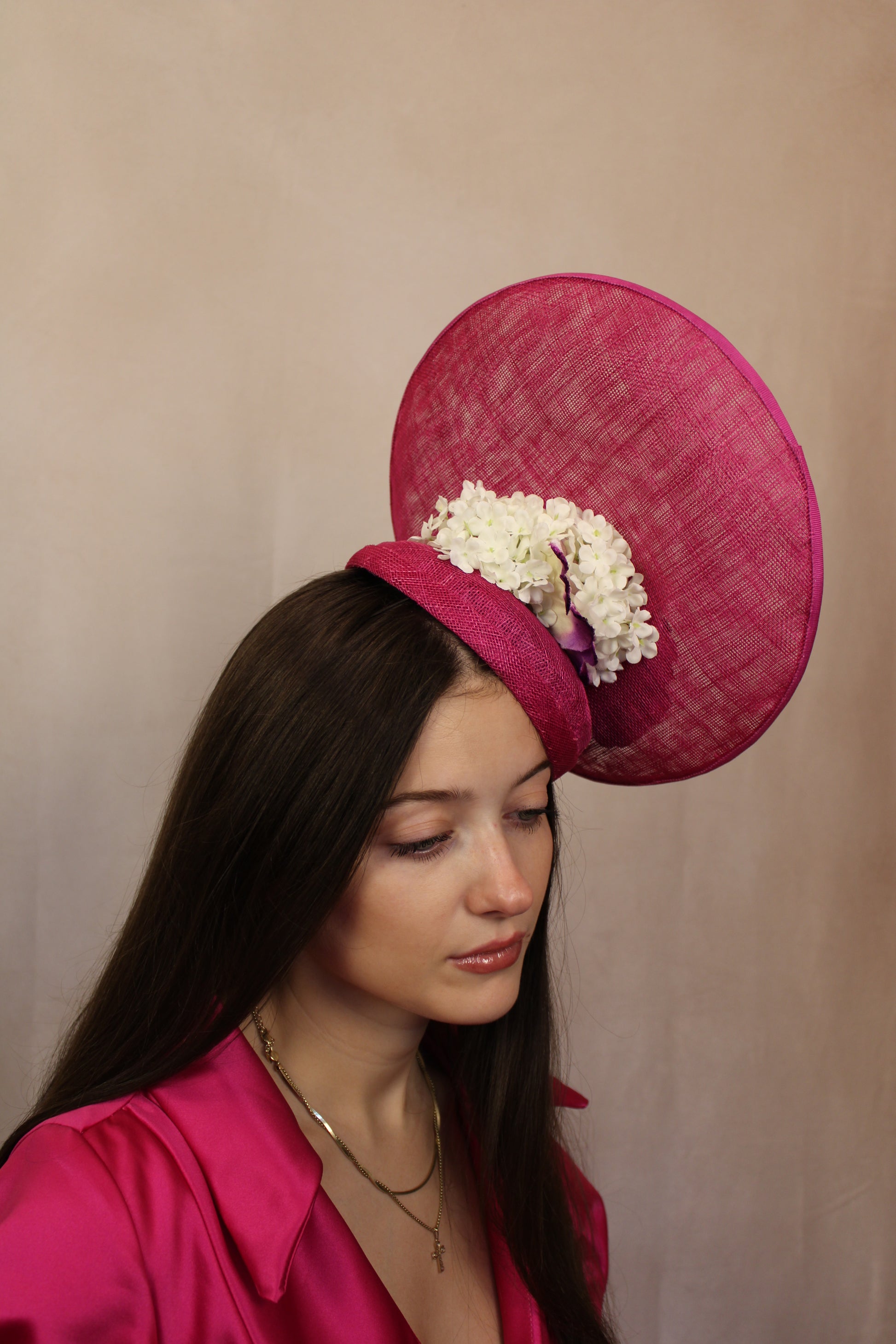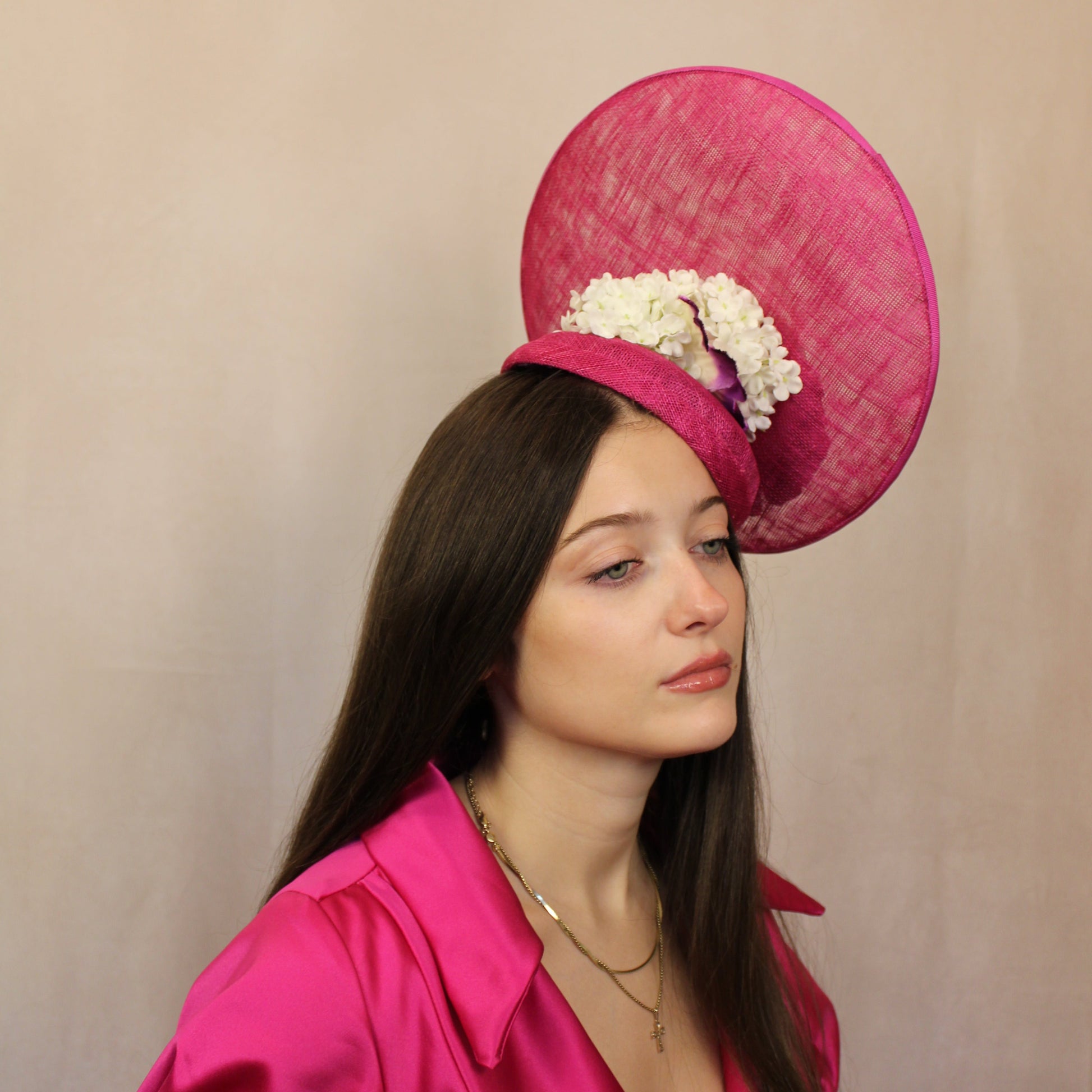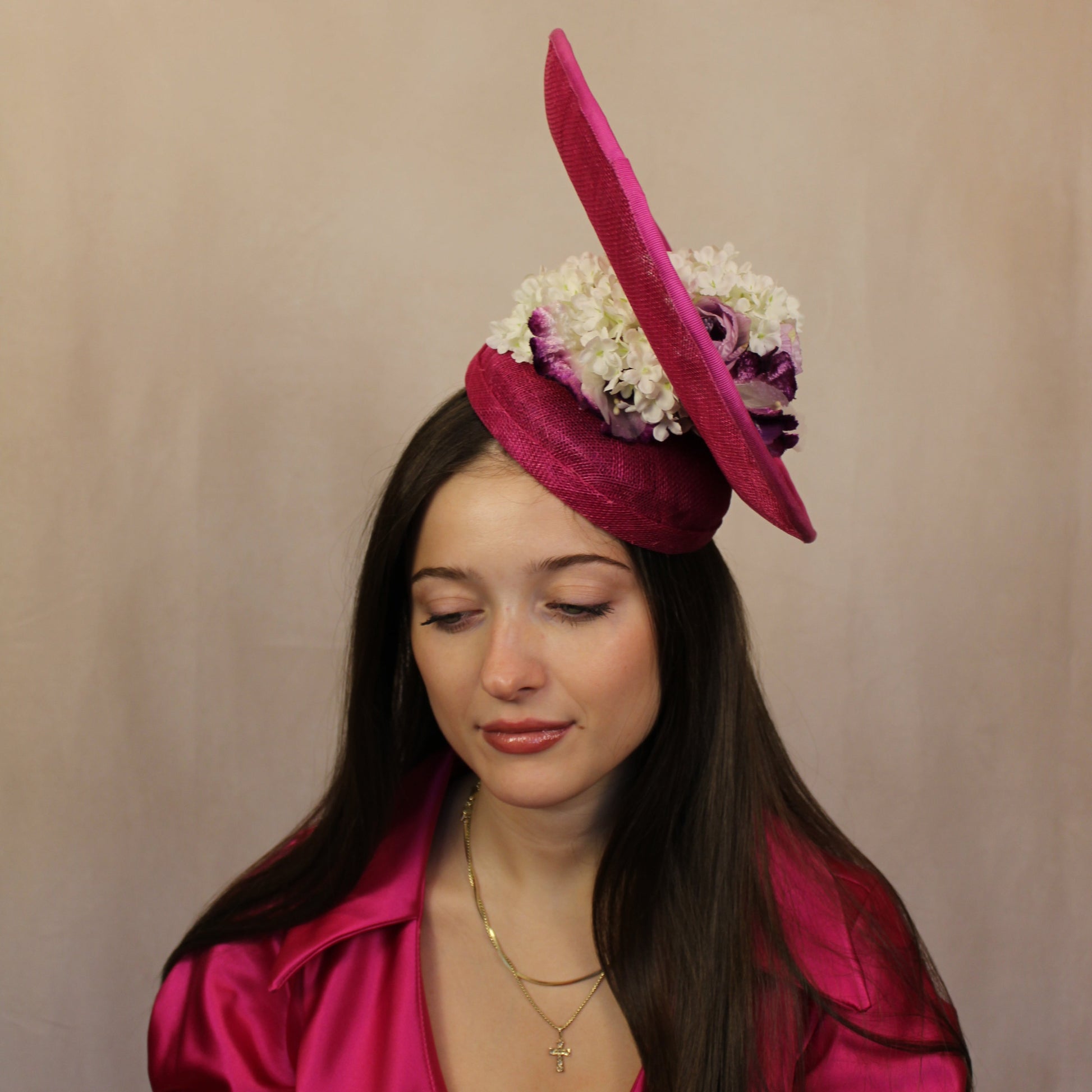 Beautiful hand made luxury fuchsia pink floral hat with off-white and lilac purple flowers. This elegant hat would be the perfect accompaniment to a mother of the bride, or a race day look. It features an elastic attachment which secures the fascinator to the head - please let me know what hair colour you have when ordering so I can customise the elastic to match your hair tone.